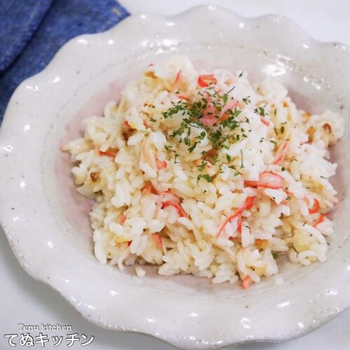 コスパ抜群!材料のせて炊くだけでめっちゃ美味しい!『カニカマバターピラフ』の作り方