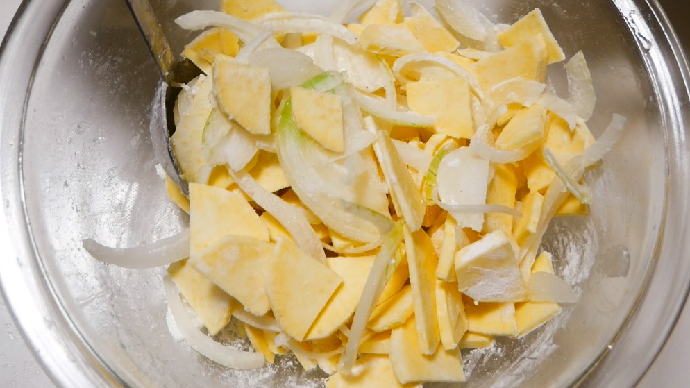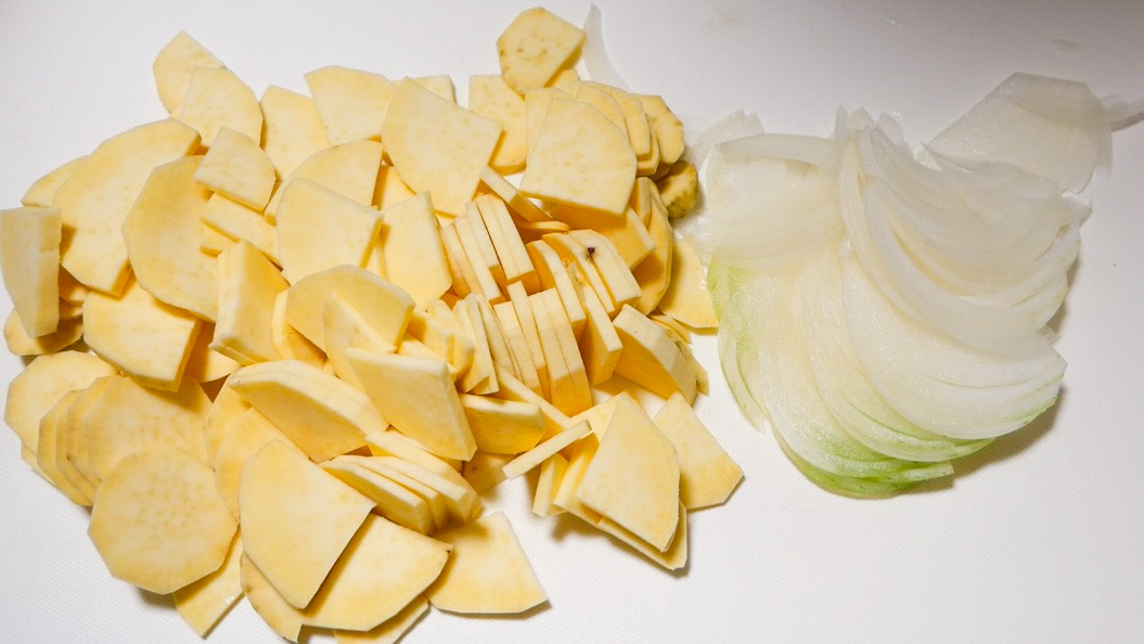 1)さつまいもは皮をむき、薄めのいちょう切りにし、玉ねぎは薄切りにします。