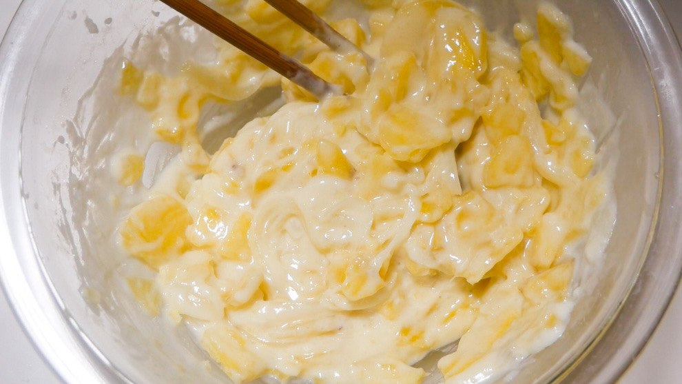 3)牛乳を入れてざっくりと混ぜてバターをのせ、ふんわりとラップをして電子レンジ(600w)で5分加熱します。