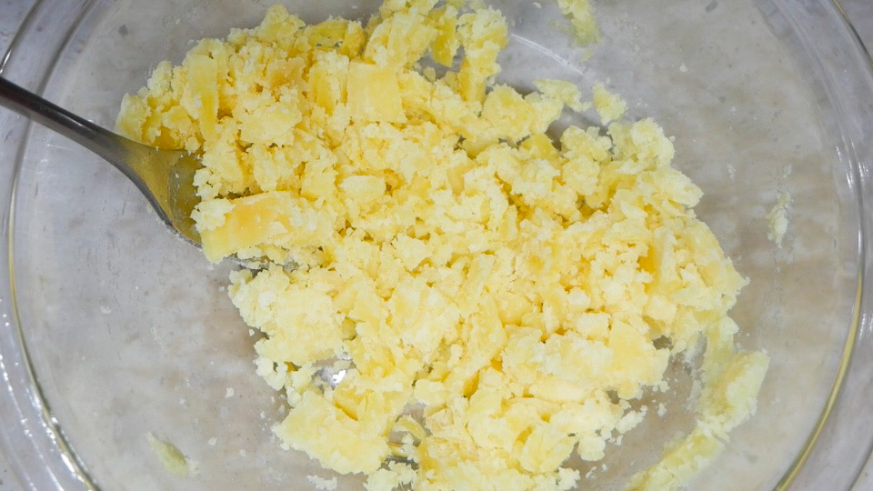 3)1)の加熱が終わったら水を捨てて、熱いうちにフォークなどでマッシュしてから粗熱をとります。