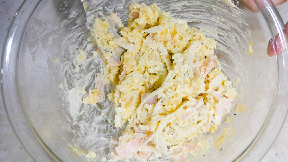 4)粗熱が取れたら、2)とマヨネーズを入れて和えます。塩で味を調えて、ブラックペッパーを振って混ぜたら完成です。