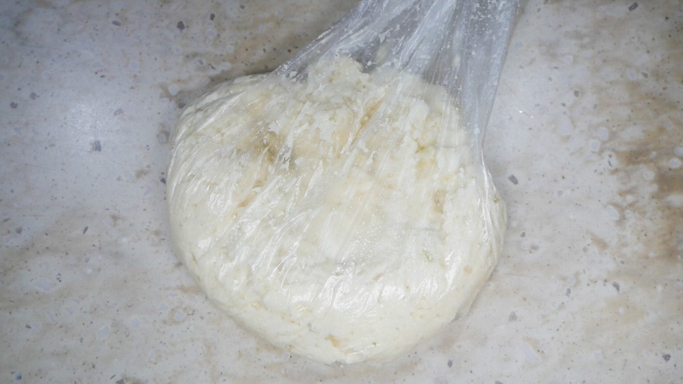 2)ポリ袋に1)とはんぺんと絹豆腐と☆印を入れてもみ混ぜます。(はんぺんは開封前に袋の中でもんでおくと混ぜ合わせやすいです!)