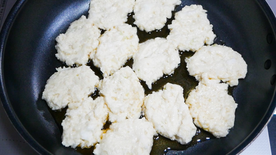 3)冷たいフライパンにごま油を入れて、2)を大さじスプーンですくって落として上から押して簡単に成形し並べます。