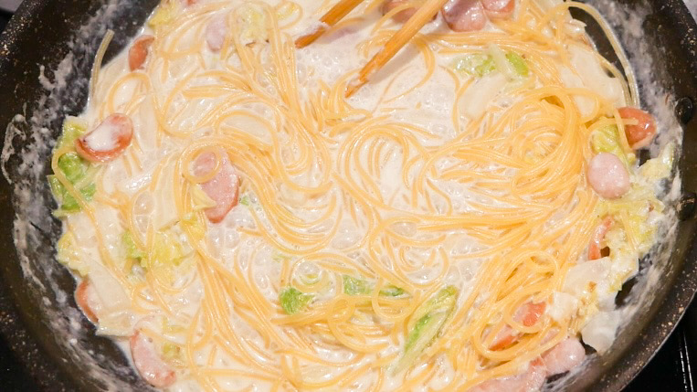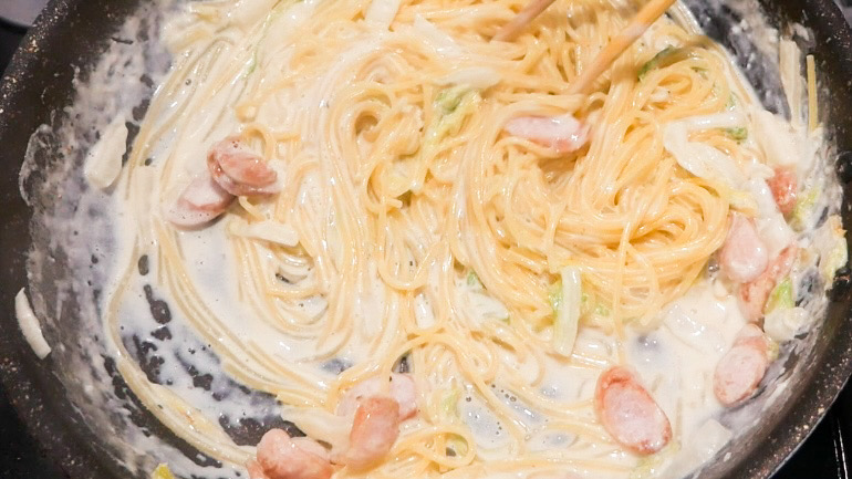 今日は、ワンパンで簡単にできる『ソーセージと白菜のクリームパスタ』を作りました!