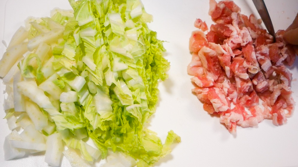 1)豚こま肉と白菜を1㎝幅に切ります。(白菜の芯の部分は気持ち細めに切って!)