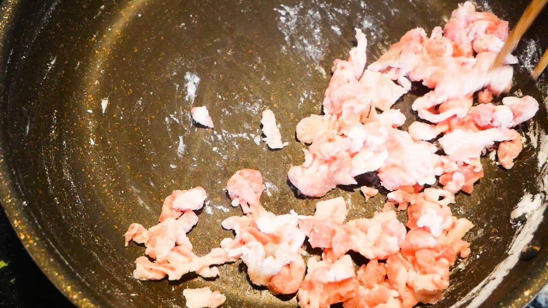 2)冷たいフライパンに豚こま肉と片栗粉を入れて菜箸で混ぜてまぶし、ごま油を全体に回し入れて白菜も入れて点火します。