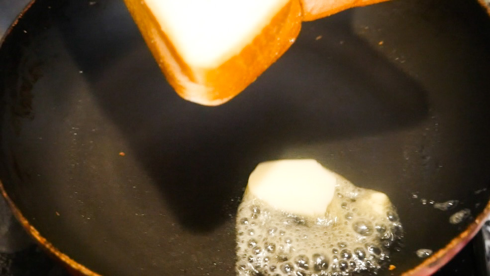 5)こんがりとしたらパンを持ち上げて、残りのバターを入れて全体に広げて、パンを裏返します。