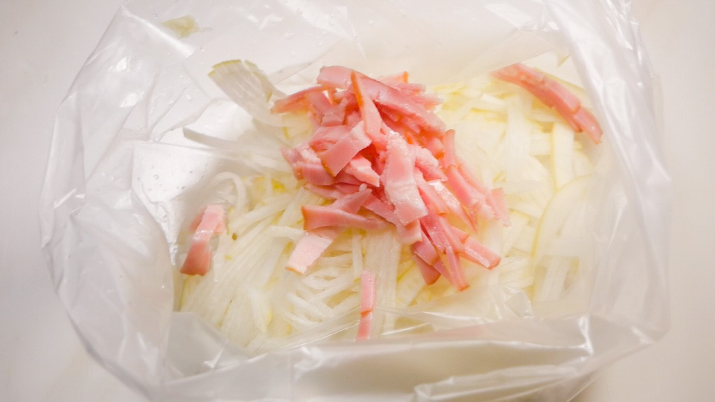 1)ポリ袋に皮付き大根を千切りスライサーでスライスして入れ、ハーフベーコンをキッチンバサミで2㎜幅に切って入れます。