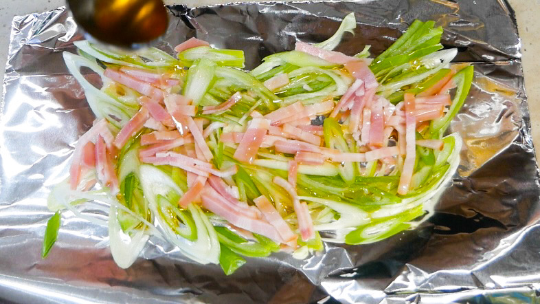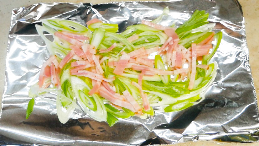 2)アルミホイルの上に、長ねぎをひろげ、その上にベーコンをひろげます。