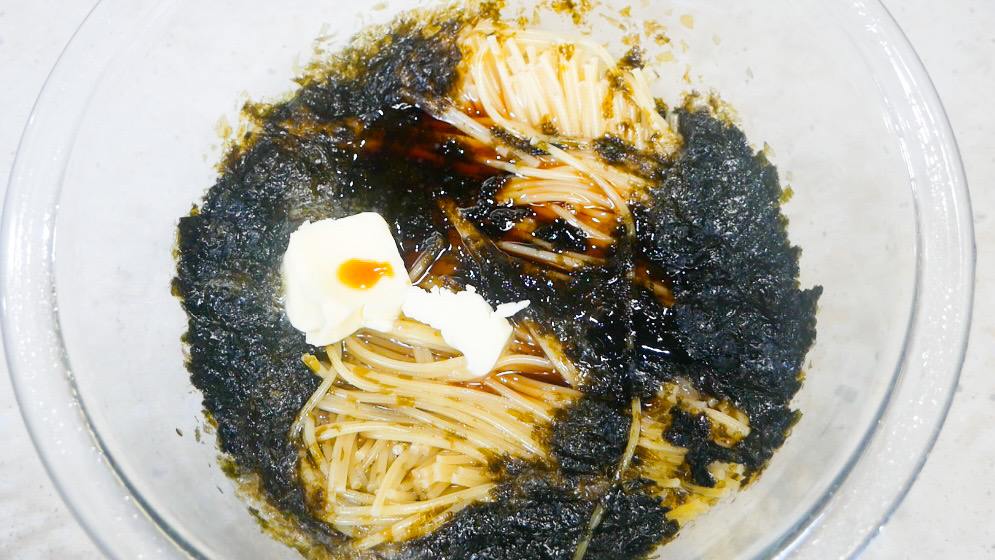 1)耐熱ボウルにパスタを半分に折って交差させて入れます。海苔をちぎってのせ水を入れたら、電子レンジ(600w)で7分30秒加熱します。